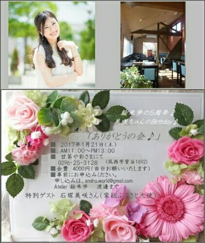 美咲ファンならご存知の通り?この日は私の誕生日なのですが有り難いことにライブのお話を頂きまして初のバースデーライブが実現しそうです(笑)まずは、ランチタイムの11時~筑西市菅谷「甘茶や彩」さんにて絵未歩さん主催の「ありがとうの会」🎵コース料理付き4,000円です😋🍴💕被災後、沢山のフラワーアレンジで心を癒してくださいました(*^^*)そのご縁からライブ出演のお話をいただきました😌✨どなたでもご参加可能です😆是非よろしくお願いいたします🎵そして、夜18時~と21時~の2回に分けて(入れ換え制です☺)常総市淵頭「ポットボーイ」さんにて「Misaki Ishitsuka A Happy New year live」を開催します😄🎵ビュッフェ+1ドリンク付きで男性4,000円、女性3,500円です😌ご一緒に新年のお祝いをいたしましょう😻🎍水害を乗り越えてきたポットボーイさんと私のエネルギーはきっとご利益ありますよ(笑)ご予約お待ちしておりますヽ(・∀・)ノ御予約フォームを作りました!! *****INFO*****石塚美咲復興支援CD「夢の続き」の製作費を除く売上の半分434円は●2015年10月~12月末日57,330円分は「常総名産会いしこら倶楽部」の水没したパンフレット再版費として寄付。印刷は被災した市内の岩見印刷にて行いました。●2016年1月~は常総市義援金へ充てさせていただきます。・1月~3月まで89枚38,626円。常総市義援金募金26,175円。合計64,801円。・4月~6月まで38枚16,492円。常総市義援金募金3,457円。合計19,949円。・7~9月分合計101枚43,834円、義援金募金6,626円。合計50,460円 ●被災店舗にて設置販売のCDにつきましては1枚に付き500円を被災店舗へ寄付。________私は、大きな損害を受けた常総市が今後しっかりと再建するには皆様からの支援が途絶えた後に自立して行けることが不可欠だと考えます。私の活動規模で、何が出来るか考えた時この常総市の名産を多くの方に知っていただき購入していただくことが、後の常総市を支えてくれる大きな資源になると感じました。●常総市では義援金を2017/3/31まで受付しております。引き続き、ご支援をいただきますよう、よろしくお願いいたします。**********☆美咲スケジュール☆【◆=LIVE ◇=司会】 ♡1月1~3、5日他 今年も一言主神社にて巫女さんとしてご奉仕♪ ◆1/21(土)11時~筑西市菅谷 甘茶や彩「ありがとうの会」コース料理付き4,000円LIVE出演。 ◆1/21(土)18時~&21時~常総市淵頭ポットボーイ「Misaki Ishitsuka A Happy New Year Live」ビュッフェ+1Drink付き 男性4,000円 女性3,000円 ◇「神保シェフと茨城をたべよう」 毎月16日更新!【Youtube】on-air!FM84.2ラヂオつくば 毎週火曜日23:00~「石塚美咲と唄種ラヂオ」 番組宛てメッセージはこちら※ネットでのご視聴はサイマルラジオから♪復興支援CD「夢の続き」4曲入り 1,000円(税込)普通郵便にて郵送。送料200円~詳細・ご注文詳はこちら。●YoutubeにてSample音源を公開しています。石塚美咲ミニアルバム「Crescendo」<配信先>iTunes Amazon1stフルアルバム「Tout de moi」 10曲配信中!<配信先>iTunes mora<着うた>レコチョク TSUTAYAプレミア GIGA MUSIC mu-mo music.jp美咲Live映像「YouTube」出演依頼:Voice Presenterまでお問い合わせお願い致します。