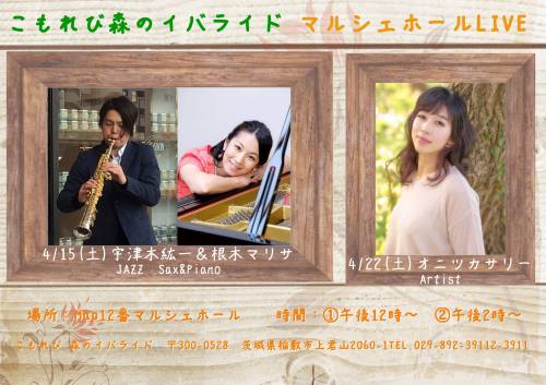 今週と来週のこもれび森のイバライド「マルシェホール」でのLIVEをご案内いたします(*^^*)4/15(土)は国内外で活躍しているお二人、宇津木紘一さん&根木マリサさんによるサックスとピアノのJAZZ LIVE(*^^*)そして4/22(土)はかすみがうら市ふるさと大使のオニツカサリーさん(^^)/故郷を愛する気持ちを音に乗せて♪是非、お越しください(*´ω`*)♪「こもれび森のイバライド」http://www.ibaraido.co.jp/おとな(中学生以上) 1,000円こども(4歳〜小学生) 600円3歳以下 無料500円の駐車券は、園内にて1,000円以上のお食事又はお買い物をされた場合に限り500円分のクーポンとしてご利用いただけます。(1回のみ有効となります。) *****INFO*****石塚美咲復興支援CD「夢の続き」の製作費を除く売上の半分434円は●2015年10月~12月末日57,330円分は「常総名産会いしこら倶楽部」の水没したパンフレット再版費として寄付。印刷は被災した市内の岩見印刷にて行いました。●2016年1月~は常総市義援金へ充てさせていただきます。・1月~3月まで89枚38,626円。常総市義援金募金26,175円。合計64,801円。・4月~6月まで38枚16,492円。常総市義援金募金3,457円。合計19,949円。・7~9月分合計101枚43,834円、義援金募金6,626円。合計50,460円・10~12月分は0円でした。 ●被災店舗にて設置販売のCDにつきましては1枚に付き500円を被災店舗へ寄付。________私は、大きな損害を受けた常総市が今後しっかりと再建するには皆様からの支援が途絶えた後に自立して行けることが不可欠だと考えます。私の活動規模で、何が出来るか考えた時この常総市の名産を多くの方に知っていただき購入していただくことが、後の常総市を支えてくれる大きな資源になると感じました。●常総市では義援金を受付ております。引き続き、ご支援をいただきますよう、よろしくお願いいたします。**********☆美咲スケジュール☆【◆=LIVE ◇=司会】◆5/27(土)12時&14時@こもれび森のイバライド「マルシェホールLIVE」 ◇「神保シェフと茨城をたべよう」 毎月16日更新!【Youtube】on-air!復興支援CD「夢の続き」4曲入り 1,000円(税込)普通郵便にて郵送。送料200円~詳細・ご注文詳はこちら。●YoutubeにてSample音源を公開しています。石塚美咲ミニアルバム「Crescendo」<配信先>iTunes Amazon1stフルアルバム「Tout de moi」 10曲配信中!<配信先>iTunes mora<着うた>レコチョク TSUTAYAプレミア GIGA MUSIC mu-mo music.jp美咲Live映像「YouTube」出演依頼:Voice Presenterまでお問い合わせお願い致します。