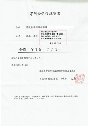 常総市復興支援CD「夢の続き」をご購入いただきました皆様、ライブ会場での募金にご協力くださいました皆様、 誠にありがとうございます。受領書にて活動報告をさせていただきます。2017年1月~3月までは・常総市復興支援CD「夢の続き」36枚×434円=15,624円・常総市義援金募金 4,150円 合計19,774円引き続き、ご支援・ご協力賜りますようお願い申し上げます。 *****INFO*****石塚美咲復興支援CD「夢の続き」の製作費を除く売上の半分434円は●2015年10月~12月末日57,330円分は「常総名産会いしこら倶楽部」の水没したパンフレット再版費として寄付。印刷は被災した市内の岩見印刷にて行いました。●2016年1月~は常総市義援金へ充てさせていただきます。・1月~3月まで89枚38,626円。常総市義援金募金26,175円。合計64,801円。・4月~6月まで38枚16,492円。常総市義援金募金3,457円。合計19,949円。・7~9月分合計101枚43,834円、義援金募金6,626円。合計50,460円。・10~12月分は0円でした。・2017年1月~3月までCD36枚15,624円。義援金募金4,150円。合計19,774円。 ●被災店舗にて設置販売のCDにつきましては1枚に付き500円を被災店舗へ寄付。________私は、大きな損害を受けた常総市が今後しっかりと再建するには皆様からの支援が途絶えた後に自立して行けることが不可欠だと考えます。私の活動規模で、何が出来るか考えた時この常総市の名産を多くの方に知っていただき購入していただくことが、後の常総市を支えてくれる大きな資源になると感じました。●常総市では義援金を受付ております。引き続き、ご支援をいただきますよう、よろしくお願いいたします。**********☆美咲スケジュール☆【◆=LIVE ◇=司会】◆5/27(土)12時&14時@こもれび森のイバライド「マルシェホールLIVE」 ◇「神保シェフと茨城をたべよう」 毎月16日更新!【Youtube】on-air!復興支援CD「夢の続き」4曲入り 1,000円(税込)普通郵便にて郵送。送料200円~詳細・ご注文詳はこちら。●YoutubeにてSample音源を公開しています。石塚美咲ミニアルバム「Crescendo」<配信先>iTunes Amazon1stフルアルバム「Tout de moi」 10曲配信中!<配信先>iTunes mora<着うた>レコチョク TSUTAYAプレミア GIGA MUSIC mu-mo music.jp美咲Live映像「YouTube」出演依頼:Voice Presenterまでお問い合わせお願い致します。
