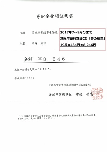 ご報告が遅れましたが、10月8日に2017年7月~9月までのCDの売上の半分を常総市義援金口へ振込いたしました。CDの売上からの寄付は総額186,796円になりました。募金活動からの寄付は40,408円で、合わせて227,204円です。ご協力くださいました皆様、誠にありがとうございます。受領書にて活動報告をさせていただきます。引き続き、ご支援・ご協力賜りますようお願い申し上げます。被災した私が一番欲しかったのは「お金」です。全国の被災した同じ心境の皆様の中々声に出来ない本音を行動で示したいとも思い活動を続けています。私が再建に一番必要だったのは「お金」でした。だから、ミュージシャン仲間・関係者の皆様の援助を頂き少ない予算でCDを作り、制作チームの愛情と購入して下さる皆様の愛情を私と常総市の被災した皆様で分かち合おうと思ったのです。ご協力いただきました皆様、本当にありがとうございます!そして、今も災害からの復旧で今までの生活が奪われた皆様へ沢山の思いやりのある支援が届くことを願っています。*****INFO*****☆美咲スケジュール☆【◆=LIVE ◇=司会・TV】◇11/26(日)9:30~15:00しもだて商工まつり 司会 アルテリオ前広場~稲荷町通り ◆12/15(金)16:00ライブ19:00音楽と共に~常総めぐり~美咲&John15周年記念ライブ @豊田城(常総市地域交流センター) ※詳細&ご予約 Vo.石塚美咲×Pf.John Nakayama×Dr.目次敬之 ◆12/16(土)17(日)稲敷市こもれび森のイバライド Live Vo.石塚美咲×Pf.John Nakayama 要入園料・駐車料金◆12/23(土)12:30~稲敷市こもれび森のイバライド Live◆12/23(土)会場14:30開演13:00つくば市カピオホール カフェ「ベルガ」 予約029-859-0192 Gt.角圭司 Vo.石塚美咲(2部のみ、カヴァー曲ライブ)3,000円(1Dr付)◇ 毎月16日更新!ケーブルテレビJway 「神保シェフと茨城をたべよう Season3」【Youtube】on-air!◇毎週火曜日20:00~Vチャンネルいばらき 「美咲&Johnのいばらき♡ch」【Youtube】on-air!復興支援CD「夢の続き」4曲入り 1,000円(税込)普通郵便にて郵送。送料200円~詳細・ご注文詳はこちら。●YoutubeにてSample音源を公開しています。**********石塚美咲復興支援CD「夢の続き」の製作費を除く売上の半分434円は●2015年10月~12月末日57,330円分は「常総名産会いしこら倶楽部」の水没したパンフレット再版費として寄付。印刷は被災した市内の岩見印刷にて行いました。●2016年1月~は常総市義援金へ充てさせていただきます。・1月~3月まで89枚38,626円。常総市義援金募金26,175円。合計64,801円。・4月~6月まで38枚16,492円。常総市義援金募金3,457円。合計19,949円。・7~9月分合計101枚43,834円、義援金募金6,626円。合計50,460円。・10~12月分は0円でした。・2017年1月~3月までCD36枚15,624円。義援金募金4,150円。合計19,774円。・4月~6月までCD16枚6,944円。義援金募金0円。・7月~9月までCD19枚8,246円。義援金募金0円。 ●被災店舗にて設置販売のCDにつきましては1枚に付き500円を被災店舗へ寄付。________●常総市では義援金を受付ております。引き続き、ご支援をいただきますよう、よろしくお願いいたします。**********石塚美咲ミニアルバム「Crescendo」<配信先>iTunes Amazon美咲動画「YouTube」出演依頼:Voice Presenterまでお問い合わせお願い致します。