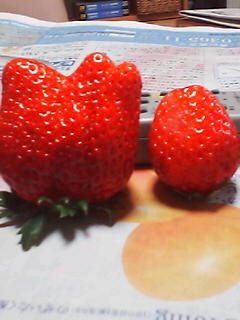 今回のインフルエンザ参った!・・ねとにかく生まれて初めてかかった今までにいろんな風邪はひいたけど今回、自分では把握できないものでしたでもお世話になったのが 果物でした誰もいなかったこともあって 自分でとにかく早く脱出せねばと行動したのが食欲がないから でもとにかく水分補給とビタミンCを取らねばと いちごとトマトを無理やり口にほうばってましたそのときにあまりにも大きくて変わった形でしたから撮っておきました これで救われたようなものでした右側が通常の大きさです!これってすごいでしょう! 形はチューリップ見たいですでも 皆様風邪を引いたときは ビタミンが欠乏するらしいから一生懸命 補給してくださいね!(^^♪