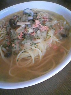 今日は何とも気持ちよい一日でした。お散歩日和です本日のパスタしめじ と 鮭 のスープパスタ↓ スープはコンソメ仕立てです。最近パスタの画像をUPしてますがこれには訳がありまして・・・パスタばかり食べている私を知っている友人がパスタのレパートリーを増やしたいから私が作ったパスタを紹介して欲しいと言われまして・・・それで、簡単ながら画像をUPしている訳です。○○ちゃん、こんな感じでいかがですか~