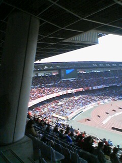 マリノスvs.レッズです。日産スタジアムでしたので出掛けて来ましたよぉ~キックオフ一時間前だというのにこのサポーター達。↓・・・って言うか、1時間前に会場に居た私たちも珍しいのですが・・・(^^;前節までの順位はマリノス1位レッズ2位今日レッズが勝てばこの順位が入れ替わります。ガンバレ、レッズ・・・で始まった試合は押しつ押されつで0-0のまま前半は終わるのかと思った43分山田が入れてくれて1-0で折り返しいいぞぉ~私の周りは真っ赤なサポーター達。そりゃぁ、もう大騒ぎでしたよ。後半に入ってすぐにワシントンが個人技からのGOALその後小野ッチが決定的なGOALを外しちゃって・・・本人もゴール前で呆然と立ち尽くすしちゃって。GKの都筑が好セーブしてくれて失点も無くこのまま2-0で終わるのかっと思ったらロスタイム突入直前でマリノスがGOAL。あっちゃぁ~しかし、ここでやってくれたのが長谷部直後に取り返してくれましたワかくして3-1レッズの勝利本日の来場者数は50,572人でした。メインスタンドが結構空いてたのでこんなもんでしょうか。闘莉王がヘディングで競った場面今日は負けなかったよね。さて、試合も終わってお腹が空いた気が(!?)したので夕飯でも食べて帰ろうということになりました。さて?? どこで食べよう・・・帰り道だし久しぶりにラー博に寄りましたぁ↓ いやぁ、何年ぶりだろう???近くに引っ越してきたのにいつでも来れるという気持ちからか一度も来てなかったんですよねぇ。8月までの企画でオリジナルカップラーメンが作れる!!と言うのがありました。企画物大好きな私はもちろん体験してきましたよぉ。こんなご丁寧にパッキングまでしてくれて。私はシーフードスープに蒸し鶏・グリーンアスパラ・エビ・チェダーチーズ主人はカレースープにエビ・チェダーチーズ・蒸し鶏・カニかまでお好みカップラーメンを作りました。パッケージのデザインはどちらもお子ちゃまレベル・・・いつ食べようかなぁ~。