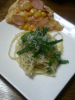 本日の昼食ですしらすと大葉のパスタ↓ 奥にあるのは、昨日の残りの生地でピザを・・・先日、友達とランチをしたときに食べたメニューを真似てみました。サッパリ・スッキリで美味しかったぁ。材料は・・・しらす大葉味付けは・・・こぶ茶胡椒(しらすの塩分があるので塩は要らないみたい)K子さん、お勧めよぉ~