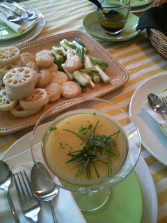 職場の友人と集ってお料理会です。本日のメニュー豆乳ゼリーホタテと蓮根のグリル・レモンビネグレットソース夏野菜のスパイシースープにんにく風味のパンオレンジケーキどれもこれも美味しかったぁ~豆乳ゼリーは超簡単で料亭の前菜のようにコ洒落た感じ。早速、明日の定例会に出そうかと。。。お料理会の後に、天然素材のビーズネックレスをみんなで作りました。満足満足。