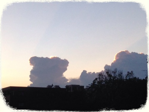 モーレツな暑さモクモク雲が何かに見える(笑)夕日に照らされた雲〜キレイな夕暮れ街では「うなぎ」「鰻」「う」…そんな、土用の丑の日の今日我が家は冷やしうどん同じ「う」だよ(´艸`)
