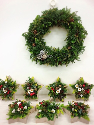 クリスマス・アレンジ星型の器にヒバなどのグリーンを入れて〜今日のお茶菓子はクリスマスなのでケーキ(๑˃̵ᴗ˂̵)و ヨシ!アトリエうかいムース・オ・ショコラ少し早めのメリクリー