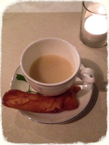 本日のDinner根セロリのブルーテクリスピーな折パイ添えブルーテ濃厚で美味しい!!新鮮野菜のカプレーゼ生ハム添え釜揚げシラスのリゾットパルミジャーノのクロカンとフォアグラ添え釜揚げシラスで良い塩梅クロカンが香ばしい香り~アサリとお野菜たっぷりミネストローネイサキのソテーとアサリと野菜の旨味で優しいお味身体に染みわたる~牛ほほ肉のブレゼ赤ワイン煮お肉トロトロ、柔らか~い子羊のロースト香草風味ガトー抹茶&ショコラオレンジの皮にリキュールをかけてファイヤーハイ、出来上がりクレープシュゼット帰り際に「内服薬」ならぬ「内服楽」だって(笑)中身は、ハートのチビマカロン美味しく楽しくいただきました。今週も一週間頑張ります!(^^)!