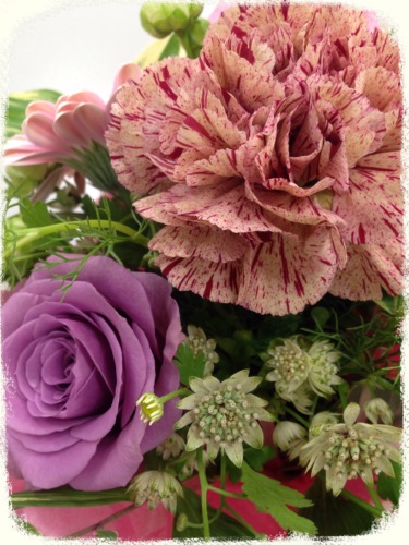 大人なカラーのカーネーションをメインにブーケカーネーションガーベラバラ(2種)グリーンミストアストランティアマトカリナルコラン