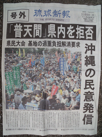 明日11月8日は「辺野古への新基地建設と県内移設に反対する県民大会」が開催される。こちらの新聞では連日、社会面のトップで関連記事が掲載されていて、市町村レベルでの実行委員会の立ち上げも相次いでいる。4日までに沖縄市、宜野湾市、北谷町、北中城村、与那原町、大宜味村、浦添市、西原町で実行委員会が設立。会場までの無料バスを提供する市町村は今帰仁村、北谷町、与那原町、大宜味村、沖縄市、北中城村。 美しい辺野古の海に泥を流し、セメントを流し埋め立てることもやむなしと考える人が大勢いる現実。突然出てきた嘉手納統合案に嘉手納の住民は大反対している。「今でさえ我慢の限界の騒音なのに、さらに基地を押し付ける気か」と。すでに基地があり時間がかからないという理由なら、自民党の政治家が日本各地に作った飛行場がやまほどあるじゃないか。日本航空が撤退したら使われない飛行場が沢山あるじゃないか。そこ使えば良いじゃない。民主党に期待して投票したんだよね。佐藤学沖縄国際大学教授は「衆院選で沖縄の4選挙区で県外移設を訴える候補者が当選した事で民意がはっきりと示されたにもかかわらず、県民大会が必要とされる不公平な状況を認識しないといけない。なぜ沖縄だけ、民意のハードルを上げられる必要があるのか。」と。(沖縄の選挙区は4つ。つまり全てです。自民党は全選挙区で落選した。)アメリカと対等の政治なんて少しも期待していないが「ベッドの隅でアメリカのご機嫌をチラ見する自民党方式」から「あんまり怒らせると何するかわかんないわよっ!阿部定にだってなっちゃうかもよ民主党は!」との『妄想』をアメリカに抱かせるくらいはしてほしい。ダライ・ラマが5日、那覇で講演した。チケット取れなかったけど新聞によると来場者との質疑応答で、米軍基地を過重負担している沖縄の現状について意見を求められて「武力は撤廃されるべきだ。ただ、アジアの情勢など世界的視野で考えたとき、一時的に受け入れる状況があることも理解する必要がある」と慎重に答えたそうだ。14世が徒歩でインドに亡命してからおよそ60年かな。沖縄も戦後に基地を抱えて60年。歴史そのものを生きるダライ・ラマの言う「一時的」とはスパンが長そうだなぁ。県民大会は明日の14時から。終わり次第16時から始まる「珊瑚舎スコーレ夜間中学応援チャリティー興行」の女子プロレス沖縄大会に行ってきます。後半の参加になるだろうけどね。県民大会で怒りを、女子プロ大会でアジャコングに愛を見てこよう。