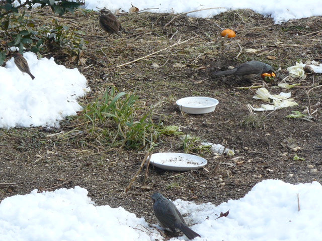 今年の特徴は、今までは少なかったムクドリも大挙してやってくるようになったことと、メジロも群れでくるようになり、しかも、今までと大きく違うのは、多種類の鳥たちが入り乱れて餌をあさるようになったことです。