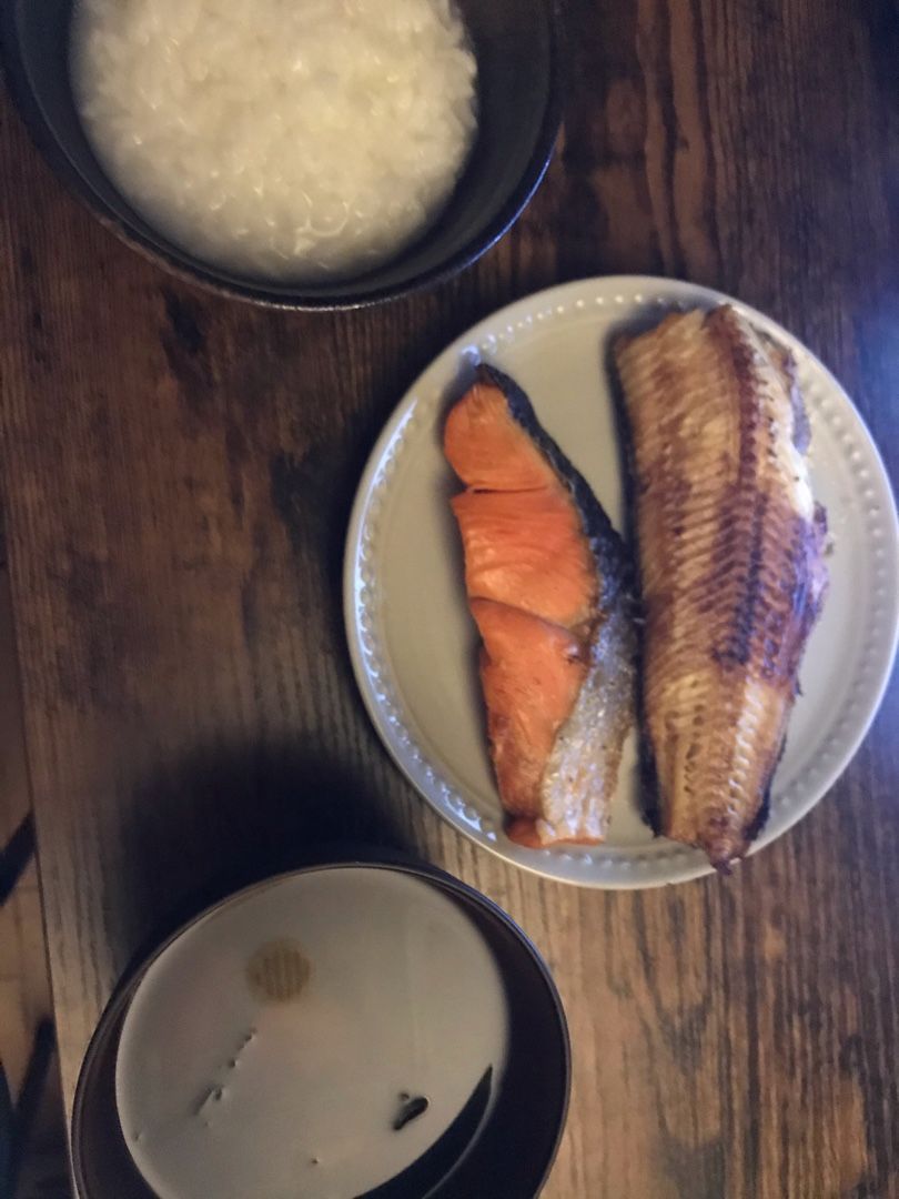 眠たい… でもちゃんとごはん。 おかゆと魚と なんて「和」なのかしら 嫁の一言→シャケうまーー おやすみなさい💤