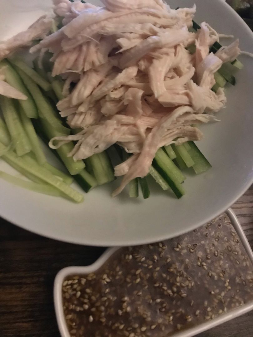 鶏ムネ肉(酒と水で茹でた) と きゅうり(切っただけ) の 甘味噌ダレ(味噌と砂糖とごま油と醤油と白胡麻を適当に混ぜたもの) 茹でた汁はワカメと卵いれて塩味スープに。 本日の嫁の感想→ 甘めの味付けでおいしい!! 気に入ってもらえてよかった 完食していただけたのでよしっ