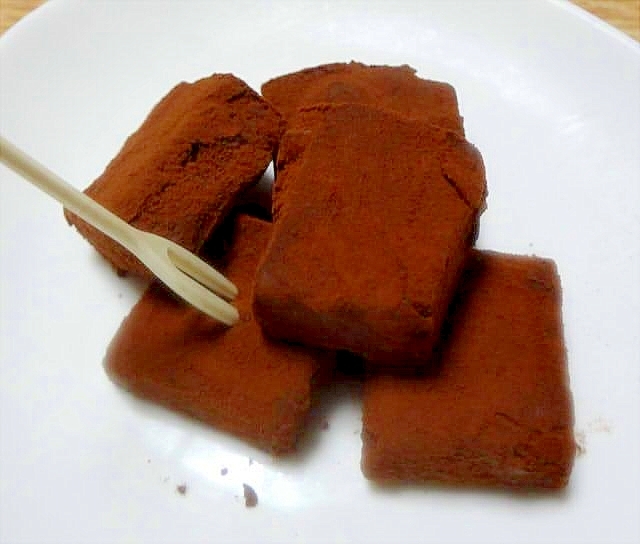 生クリームでチョコを溶かして洋酒とバターを加えるだけの簡単な生チョコ。