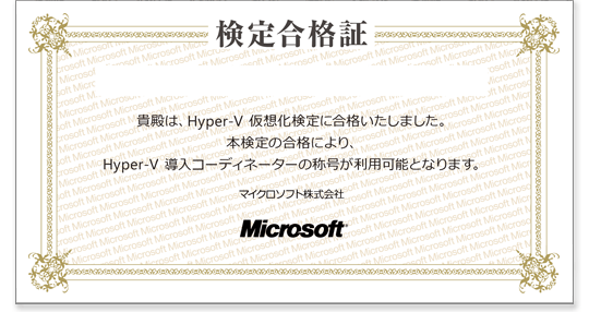 現在期限限定につき、web講習を受けその後、無料でMicrosoft Hyper-v仮想化検定を受験できる。合格者には正式に、認定証を受理できる。以前は、どうも、MCA プラットフォーム (Windows Server 2008 対応) 取得者のみだったみたいだ。早速、私も受験してみた。 結果: 不合格数回 受験したが合格にはいまのところほどとおい。しかし、早い機会に、合格したい。最短で合格目指す。★★ これより、Microsoftのサイトより引用しました。受検資格:どなたでも無料で受検できます。特 典:Hyper-V 導入コーディネーターの称号が利用可能になるほか、Hyper-V や 仮想化についての深い知識を持っていることを証明できます。また、パートナー様においては、マイクロソフト製品の販売において効果的な提案やアドバイスができるセールス スタッフであることを証明できます。 さらに、MCA プラットフォーム (Windows Server 2008 対応) を取得された方は Hyper-V 導入アドバイザーとして認められ、MCA Hyper-V アドバイザリー スタッフ ロゴ マークの使用権が貸与されます。 注 : M10-200 を取得済みで Hyper-V 導入アドバイザーをご希望の場合は、M10-201 を再度受験・合格いただく必要があります。注 : 既に R2 対応版以前の Hyper-V 導入アドバイザーを取得された方は、本検定の R2 対応版を再受検いただく必要はございません 詳しくはMicrosoft Hyper-v仮想化検定その他検定 FP3級 学科 合格済み 実技 不合格 第1回北方領土ネット検定初級 結果待ち