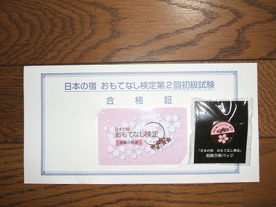 7月度に受験した、日本の宿 おもてなし検定を合格することができた。 サイト発表にて合格IDがあったので、合格は確信していた。やはり合格は嬉しいものです。ちなみに試験結果は52/60 点でした。合格基準:48点(80%)合格問題別試験結果がおくられてきて間違ったところが確認できるのがよいですねこの試験はホテルや旅館に勤務する方には、しきたりやマナーを見極めるにはよいかもしれません。 日本の宿 おもてなし検定 初級合格証と日本の宿 おもてなし検定初級、合格バッジが送られてきた。 認定証はプラスチック型、バッチは桜がはいっており、優雅で日本独特な風情を感じられるこのバッチはいいですね。実際、ホテルなどに勤務している方はアピールできるかもしれません。詳しくは日本の宿おもてなし検定