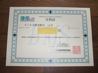 ビジネス数学検定 (新しいビジネスのかたち)財団法人 日本数学検定協会主催の本を購入した方には限定した特別試験として郵送試験で受験できるというので早速手続きをし受験した。制限時間内に問題を解き切手400円を同封のうえ解答を記入し送る。本文より合格者には3級合格証が発行され履歴書にも記入できるという 問題は5問 思考思索の問題と考えられる。 合格基準は明記されていないが推測(推定では 4/5以上) 80%以上とかんがえられる あくまでも推定なので.... 私の試験結果: 4/5 80% 合格(ギリギリの合格) 家から帰ってみると、大きな封筒だったので合格と確信。合格証書は立派な証書でした。ありがとうございます。やはり合格はうれしいものですね。 3級のレベルは、LIteもしくはLIteと2級の中間レベルと考えられる またもや合格証書がひとつ増えた。次回は12月にビジネス検定LIte(liteは受験確定)もしくは2級を受験の予定。ビジネス数学検定に自信があるという方はこの際受けてみてはいかがでしょうか。 !!(^^)!! !!(^^)!! !!(^^)!!