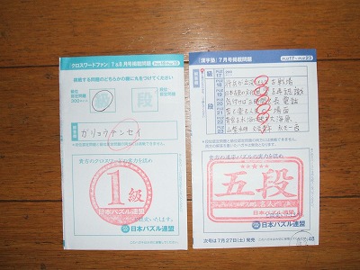 この度日本パズル連盟認定の返信ハガキが送られてきた 最高の気持ちですね。公式認定証が楽しみですね(*^_^*) (*^_^*) ヽ(^o^)丿 ヽ(^o^)丿日本パズル連盟認定 パズル名人認定(漢字パズル 五段) クロスワード1級 認定