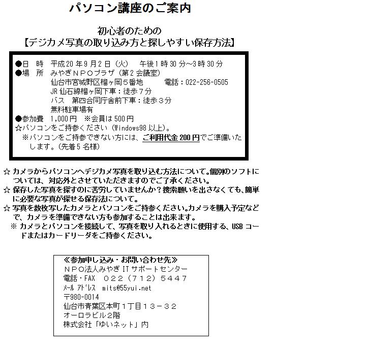 9月は、デジカメ写真をパソコンに取り込む方法と、写真をパソコンに保存していたはずなのに、なかなか見つからないというようなことがないように、わかりやすい保存法を講座にしました。皆さんのご参加をお待ちしております。