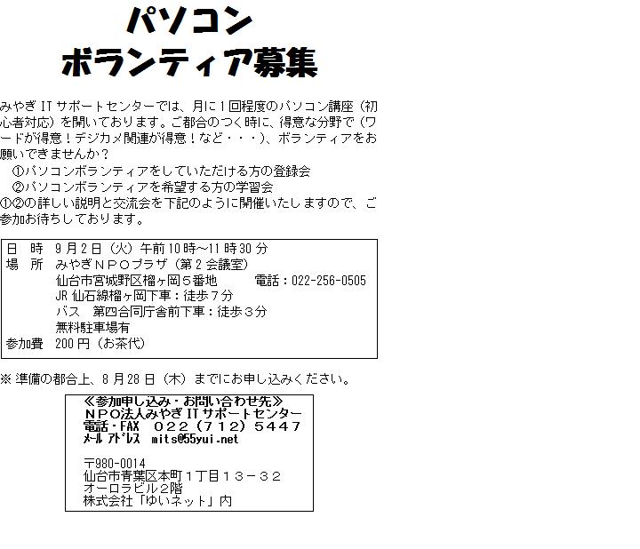 仙台市で活動しています、非営利活動団体みやぎITサポートセンターです。活動紹介などをここに記載していきたいと思います。