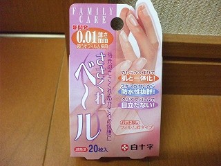 最近、「モラタメ」にはまっている私。実売価格 1,680円(税込) 送料関係費 840円です。↑4個セットでした。指先のささくれ、あかぎれの保護によいというのが、私が購入した一番の理由。これが私の荒れた指先。これに「ささくれベール」を貼ってみると、薄さ0.01mmなので、本当に薄く、最初は貼るのにこつがいりました。指先が割れているので、貼り方が難しい。あまり上手に貼れませんでした。ささくれにはよいかも。水仕事をしても、指先をしっかり保護しますとありますが、私は何度も取れてきて、貼り替えました。手荒れが気になる主婦としては、よい商品なのかも。指先のささくれ あかぎれの保護に!ささくれベール(20枚入り) 【花屋】【フローリスト】【保...