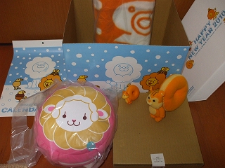 2010年のミスタードーナッツの福袋です。2000円。ここ最近はずっと購入していますが、この箱、去年のよりひと回り小さい!不景気の影響か~。中身は次の通り。・ハニーシッポのぬいぐるみ・ハニーシッポの携帯ストラップ・ハニーシッポたちのひざ掛けブランケット・ポン・デとゆかいな仲間たちの2010年カレンダー・ふるえるクッション・お皿・ドーナツ引換券20枚ふるえるクッションは、去年もはいってたよ~おまけに、今探しても見つからない大事にしていないからな。ドーナツ引換券が金額分あるから、おまけ付きと考えればお得かな。