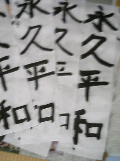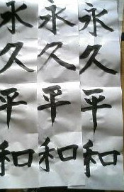 核分裂さんから、お習字が下手になっている、というご指摘もあり、今日も、筆を持つことになりました。そこで、裏技を使って書いてみました。3枚だけ。先生の目はごまかせないかな一応、オイラが書いたんだけどね。明日から、学校です。