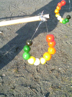 今日は、地域密着イベント、どんど焼き。神奈川1号とおだんご作って、竹棒の先に、針金でつるして、ハイ、できあがり。お正月かざり、おふだ、だるま、書初め…なども持って。いざ、公園へ。あるある、いろんな団子が。そして、火にかざします。風邪をひかなくなる、とかお習字がうまくなる、とかご利益あるかなぁ、あるといいなぁ。