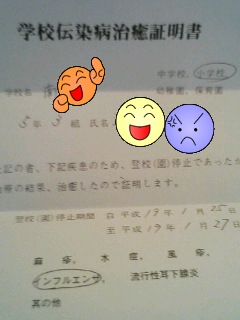 3時過ぎに帰宅した、神奈川1号。友人が、けんかをしていて、下校が遅くなったと、こぼすのです。いつになく、下校途中が大変だったというので、チョット気になりました。とりあえず、検温。「やっぱ、微熱あるでしょ、37,9度」と1号。え~、手もおでこも冷たいよ~。鼻水も咳も無いし~。「のどあめ無い?」と1号。…とりあえず鎮痛剤を飲ませ、のど飴を買いにコンビニへ。もどってきたら、「頭が少し痛いかな~」何痛いインフルエンザかも!?速攻、小児科に電話。来院の予約をとりつけ、受診。(5時でした)医師からも、「元気そうだね~。まだ、ぜんぜん流行ってないし、違うと思うよ」しかし、母、「塾で、かもしれません。違うかもしれないけど、お願いします。検査してください。」で、検査すること、15分後、A(+)B(+)医師も、「めずらしい~」即、小学校へ連絡。帰宅してから、来ましたよ。それらしくなってきました。8時には38度を超え、1号は布団の中へ。加湿器たいて、オットも私もマスクで過ごしています。明日はだいぶ楽になるでしょう。タミフルをこれだけ早く飲んだのですから。
