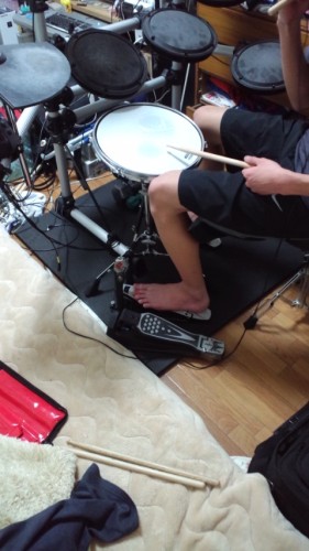 大安吉日の今日、午前中、電子ドラムの引越しをしました、神奈川1号です。黒いのは、防音マット、半畳です。フットペダルは、本物で、生ドラムにも使えます。午前中に、お父さんに手伝ってもらい、駅向こうの、元店舗の1階に、引っ越しました。~~~~~~~午後、運び忘れた、ダンベル5キロ×2つと、トイレットペーパーを持って、初練習に行きました。ところが、シャッターを上げて叩いてますと、ガラス越しに、近所の高校生が、のぞいて行きますの。私に、SOSのメールが。「カーテンか何か無い?恥ずかしい」ニトリで、カーテンか、つい立でも、買うしかない、と考えてました。とりあえず、家にあったのれんと、ガムテープを持って、雨の中、出かけて行きました。が、居ません。ケイタイにかけると、「今?ウチだけど・・・」道は1本ではないので、すれ違いになったようです。もう1回、息子に来てもらい、のれんで目隠ししました。ら、ららら、練習を始めた1号。もう1枚、のれんがあったら、丁度良い感じなので、自宅に、取りに帰りました。は~、下って、上って、よく歩きましたわ。練習室に戻って、もう1枚の暖簾を、ガムテープで固定。帰ってきました。今日から、好きなだけ、叩けるね。早速、マメができたと、こぼしてましたけど・・・
