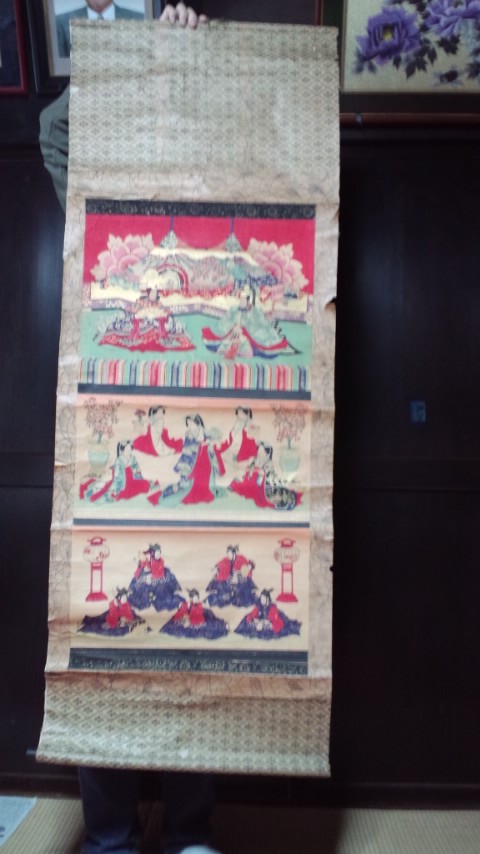 実家の開かずの蔵に、大学史学科の甥っ子が、探検に突入。ひな祭り用の掛け軸らしきもの発見。三人官女が、5人居る\(☆o☆)/いつの時代のものかな!こんなのも、ありました、館長さま~~~~色の縦縞の上の肖像画は、天皇様か、亡くなった偉い方、と聞きましたが・・・