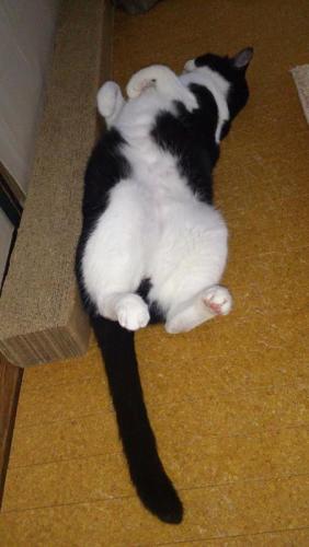 今日は、暑かったですね~。夕方になっても、涼しくならず、葉月くんも、床で、全身を冷やしているようです。そこは、爪研ぎコーナーなのね。6キロを超える、大型猫ちゃんになったそうですね。しっぽも、りっぱで、きれいねぇ。さわりたいにゃ~~ゴクッサッカー日本代表、勝って、よかったの~