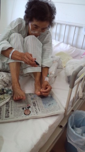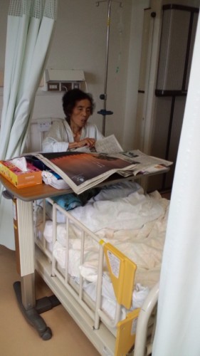21日(金)弟(S次男)のメールから。オシッコの管もとれました。ポータブルトイレが、ベッドサイドにあります。ベッドに起きてます。日に日に快復ですね22日(土)実家にお昼頃つきました、小波です。連休が多くて、オカンのために、帰省しやすくて、なかなか子孝行??今日もパワステでない軽トラで、病院へ、GOオカンは、届けたての新聞で、早速、足の爪を切ってます。読まないのかいっ!!あっ、ポータブルトイレが、片づけてないので、私がしました。こらっ、ナース~~~~っ!!それから、食後の歯磨きなど、自分でしまして片付けは、私がしました。ここのナースさんたちは、食事の介助って、どうなってるのかな~~???動けない患者さんには、食後の歯磨きのお手伝いも必要なんだけど・・・そして、検温ターイム!!しっかり、体温計を脇に、突き刺すよう、オカンに教えましたら、37.4度。う~~~ん。まだ微熱があるのね~~点滴が1日1本になったということですが、食事も少ないですし・・・やせていく一方な気も・・・と、そこへ、大阪の弟(N長男)からメール。小諸駅へ夕方着きますと。えっ?明日じゃなかったの??そこから、忙しい!!オカンの指令、飛ぶ飛ぶ。大阪に送るために、お米を3袋90キロ、精米してきてそれを台所に、広げて、さましてビニール袋を使い、箱詰めして駅へ迎えに行くまでに、それをやってはーーーーーーい。仰せの通りに。夕方、駅でN(大阪の弟)を拾って、病院へ。丁度、夕食前でした。お茶が、配られてました。5分粥と、味噌汁。キャベツのおひたし、はんぺんのエビはさみ煮など。刻んだ梅干しを混ぜて、ゆっくり食べてました。ヤクルトも飲んで、お薬も飲んで、穏やかでした。おやつと称して、クッキーもついてきましたが、それは、手をつけません。しかーーーし、明日までの二人への指令が出ましたーーーーー今夜は、お米の荷造りと、カボチャを袋詰めし、大阪に送るよう、手配して更に、明日は、畑に水を運んでタマネギの苗に、水をあげて大根の葉を間引きしてこうして、きっちり計画をたててくれましたオカン。病院を出ましたら、既に雨。「明日は、水やり、しなくていいかな~」