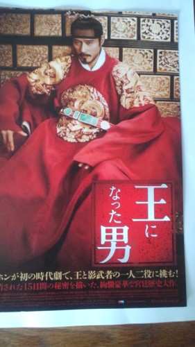 『王になった男』の試写会に行って来ました、小波です。たまたま、ペアで当たったので、韓国芸能通のmaruさんをお誘いして、有楽町まで、行ってきました。イ・ビョンホン氏の初時代劇、しかも二役ということで、期待していきました。すごい行列が開場1時間半前にはもう出来ていましたが、同階の韓国料理屋さんに入って、腹ごしらえをしてから、行列に参加しました。意外にも6列目の席に座れ、字幕も見えましたし、あんなに並んだのに、ラッキーな席でした。始まってすぐに、ビョンホン氏(道化)のコミカルな演技に、場内爆笑の連続。このまま、コミカル映画で行くのか?と心配になりましたが、やがて、情にふれて、王様らしくなっていく様子に、感情移入でき、応援したくなりました。気になっていた、会場の咳払いや、飴をむく紙の音も、段々少なくなり、お客さんたちが、集中していく様子が、伺えました。そして、最後は、お役ご免となった道化の王様は、殺されることになるのですが、本物の王様の方にも、クーデターが起き、どちらも、手に汗握る展開。皆さん、黙ってすごく静かな中、エンディングを迎えました。最後、エンドロールの時は、泣いてる方もいましたが自然と拍手がわき起こり、場内一帯感が、生まれた感じでした。昨年末の映画賞を総なめにしたというのも、うなづけます。maruさんのお勧めは、王様を支える役のリュ・スンリョン氏。悪役が多いと思ってましたが、今回は、良い味だしてました。さすがの演技力、存在感でした。