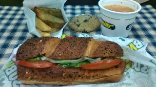 本日は外食している時間が無かったため事務所に来る途中に購入!! 昨日、しゃべくり007(日テレ)を見ていたらSABWAYのサンドイッチが出てたので食べたかったと言うのもある!! 事務所まで持ち歩いたせいか、ミネストローネスープは冷めていたが、まあまあの美味しさでした。ポテトはローストポテトだから、フライドポテトよりカロリーはダウンしてると思われる!味付けは、バジルがお気に入り!! 銀座のSABWAYは座席数が少ないためその場て食べてる席が無い。。。 今日は、ちょっぴりヘルシーなランチだったかしら??デザートにクッキーも買ってしまったよ!!