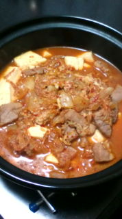 韓国でキムチチゲを頼んだことがある人はわかると思いますが。。。日本のキムチチゲ鍋とは違います。。。韓国では、キムチ+豚肉(またはツナ等)を煮込んだものをキムチチゲと言うので、日本みたいに具沢山ではありません。 まぁ、何を入れても良いのですが。。。今回は、韓国人オンニ(お姉さん)直伝のキムチチゲを私が作ってみました。オンニ(お姉さん)が作ったものには豆腐は入って無かったですが木綿豆腐をいれてみました。。。 作り方は至って簡単!1.キムチと豚肉(ツナ)を入れて、具が浸るくらい水をいれます。2.火にかけ煮立ったら、ダシダ(ビーフコンソメ)を少々入れグツグツ煮ます。3.味を整えるため、コチュカル(粉唐辛子)を入れ、豆腐を入れて再度煮ます。※キムチはすっぱくなったものがお勧めです。 至って簡単なのに、体が温まり、これぞ本格韓国料理でしょう!!