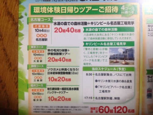 アピタの「今ある資源を大切に!地球にイイことプレゼントキャンペーン」の日帰りツアーの当選通知が主人の社宅に届きました。週末に帰って来たら詳細を確認します(*^。^*)1枚の応募だったのでびっくりです。応募ハガキではなく官製ハガキで応募しました。