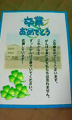 明日は長男としの卒業式。六年生になってから転校してきました。私が夫と離婚したためです。今の学校では1年間の生活でしたが、よくがんばりました。さきほどピカピカの制服を用意して眠りについたとしです。学校からのお便りを整理してると・・・以前通っていた学校からのお祝いメッセージが・・・学校経由で届いたようです。「卒業おめでとうございます。がんばる君の姿を私たちはわすれません。これからも、ずっとがんばるきみでいてください。応援しています!」覚えててくださったんだ・・・あちらの学校も卒業の準備に忙しいなか、用意してくれたんだな・・・そう思うと胸がキュンとした・・・。ありがとう。感謝。