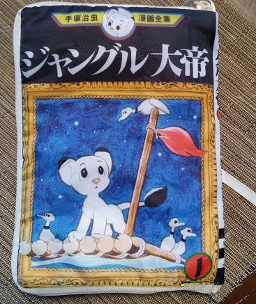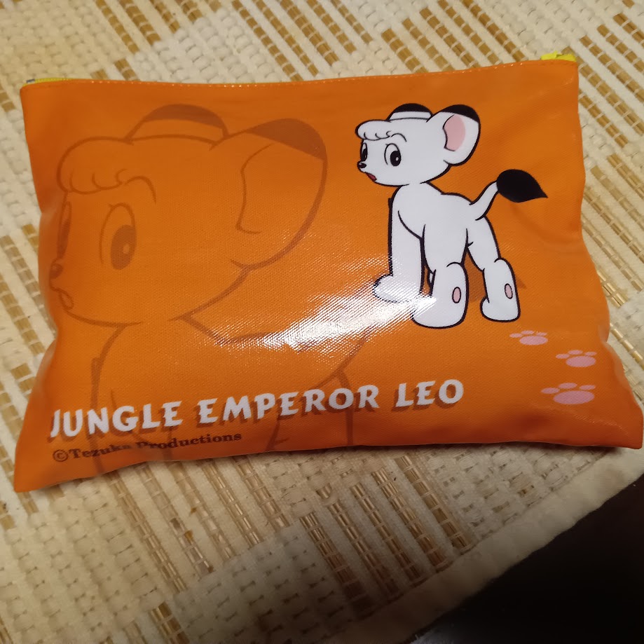 「初期手塚」のレオの絵。このポーチはチャックを開くと内側に「全集版」の名場面がプリントしてある。その名場面とはレオが王子としてジャングルの仲間に歓迎されるところ。このあたりの手塚タッチは、冴えまくっている。もうね、原画は国宝級ですよ。だが、その名場面、このポーチの印刷が悪すぎだった。