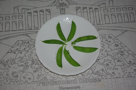 空き缶の底に穴をあけた容器で栽培している絹さやえんどう。今朝初めて収穫しました。バックはキャンベラの戦争記念館の売店で買ったオーストラリア国会議事堂の塗り絵です。