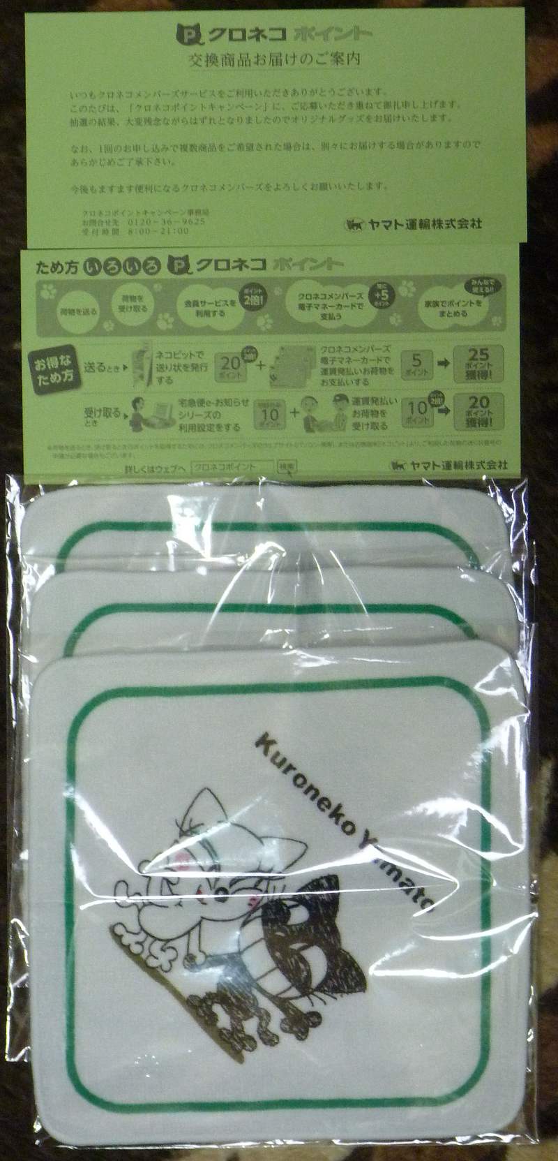 ヤマト運輸のポイントがたまってたので3口応募したら全部外れたらしく残念賞でハンドタオル?が3枚届いた。う~ん、運がない。次は頑張るぞ。そういえばコカ・コーラでもさんざん応募したけど当たらないからアクセスするのをやめた。パナソニックも全然当たらないからやめた。パナもコカ・コーラのメールも今は迷惑メール扱いにしているサントリーとかアサヒとかキリンのほうがたまに当たるから迷惑メールにはしていない。