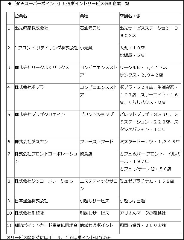 楽天、「楽天スーパーポイント」の共通ポイント事業を本格化― 11社との提携により、全国の約1万3,400の実店舗で今秋から「楽天スーパーポイント」の付与・利用が可能に ― 楽天株式会社(本社:東京都品川区、代表取締役会長兼社長:三木谷 浩史、以下 「楽天」)は、今秋に開始を予定している「楽天スーパーポイント」の共通ポイント事業において、出光興産株式会社(代表取締役社長:月岡隆、屋号:出光サービスステーション)、J.フロント リテイリング株式会社(代表取締役社長:山本良一、屋号:大丸、松坂屋)、株式会社サークルKサンクス(代表取締役社長:竹内修一、屋号:サークルK、サンクス)、株式会社ポプラ(代表取締役社長:目黒真司、屋号:ポプラ、生活彩家)、株式会社プラザクリエイト(代表取締役社長:大島康広、屋号:パレットプラザ、55ステーション)、株式会社ダスキン(代表取締役社長:山村輝治、屋号:ミスタードーナツ)、株式会社プロントコーポレーション(代表取締役社長:竹村典彦、屋号:カフェ&バープロント)、株式会社ジンコーポレーション(代表取締役社長:高橋仁、屋号:ミュゼプラチナム)、日本通運株式会社(代表取締役社長:渡邉健二、サービス名:引越しは日通)、株式会社引越社(代表取締役社長:空雅英、サービス名:アリさんマークの引越社)、釧路ポイントカード事業協同組合(理事長:石塚茂樹、店舗:和商市場等)の計11社と提携をいたしましたのでお知らせします。これにより、全国約1万3,400の実店舗において、「楽天スーパーポイント」の付与・利用が可能になります。具体的には、楽天と加盟店が新たに発行する共通ポイントカード「Rポイントカード」に収められたバーコードや磁気情報により、ポイントプログラム加盟企業の店頭のPOSや端末を介して、楽天会員が「楽天スーパーポイント」を貯められたり、ポイントによる支払いをしたりすることができるようになります。 「楽天スーパーポイント」は、2002年から開始した楽天のロイヤリティ・プログラムで、国内最大級のインターネット・ショッピングモール「楽天市場」をはじめとした楽天グループのサービスにおいて、ユーザーが商品を購入するたびにポイントが付与され、1ポイントを1円相当として貯めたり、利用したり、交換できるプログラムです。「楽天市場」のすべての出店店舗および商品でのお買い物が対象となり、「楽天トラベル」や「楽天GORA」、「楽天ブックス」、「楽天kobo」などのグループサービスにおいても活用することができます。 またポイント獲得数や獲得回数、クレジットカードの「楽天カード」の保有などの状況に応じて、5つの楽天会員ランク(レギュラー、シルバー、ゴールド、プラチナ、ダイヤモンド)を展開しており、ポイント獲得により会員ランクがあがると、ポイントがさらに貯めやすくなります。 楽天グループでは、これまでも「楽天カード」や電子マネー「楽天Edy」による実店舗における決済時において、利用金額に応じた「楽天スーパーポイント」を付与してきましたが、実店舗との「Rポイントカード」を活用した「楽天スーパーポイント」の共通ポイント事業によって、ユーザーは毎日のお買い物の際にも、「楽天スーパーポイント」を貯められたり、また利用したりすることができるようになります。 「楽天スーパーポイント」の共通ポイント事業の特長は、ポイント流通量が多いため利用価値が高いこと、全会員のメールアドレスが登録されていること、会員がセグメント化できていることなどがあります。加盟企業は自社および他社の共通ポイントとの併用も可能で、国内最大級の約9,000万人を誇る楽天会員を対象とした送客・マーケティング施策が展開できるようになります。 楽天は、「楽天スーパーポイント」の共通ポイント事業において、引き続き多くの加盟店を募ることで、「楽天スーパーポイント」の利用可能な場を拡大し、楽天ユーザーの利便性やお買い物の楽しさをさらに向上させてまいります。以上、コピペ
