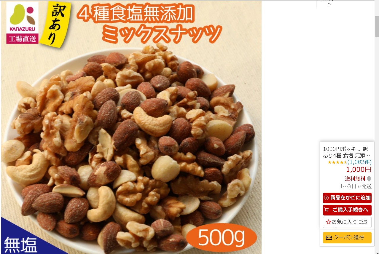 三木谷ポイントは期限が近いから嫌いだ今月で1000ポイント近くが期限だってペイペイはこんなんじゃないぞ三木谷めということで何かに使ってしまおうと奥さんと相談してナッツにした1000円ポッキリだそして届いた