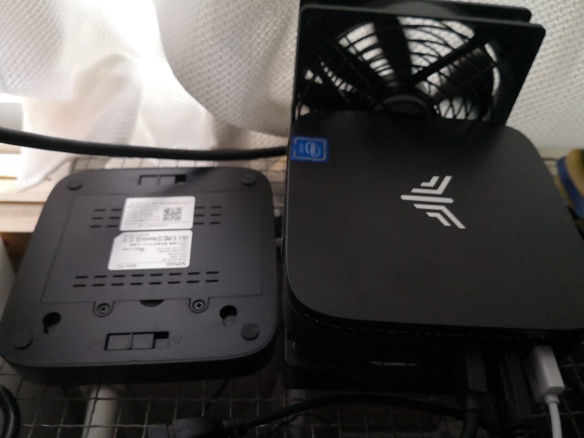 小さいUSBファンで冷やしてたこれでも効果があって長くアイドリングが続くと42度まで下がってたしかしアップデートやYouTubeを2Kや4Kで見ていると55度になってしまうということで昨日届いた12センチツインのファンで冷やしてみたその際にミニPCは2階建てになってて下段にはSSDゃ2.5インチHDDがセットできるようになっているのだが分離してみるとPC側にはたくさんのスリットがあってファンの風が効率良く入り込めるようになってるということで下段は外して下からファン、そして横にある内臓ファンの吸い込み口にもファンを当ててみたそしたらアイドリング時の42度は変わらないがYouTube見たりネット見てても温度は46度くらいで収まるようになった(^^♪メデタシかな