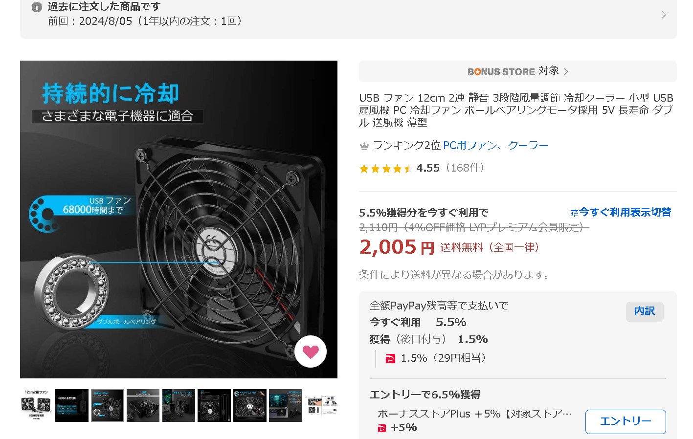 ミニPCは余ってたUSBファンを使って冷やしてたそれなりに冷えて高温になった警告は出なくはなったがまだSSDの温度が高いときは60度近くになるときがあるということで2連のファンで冷やそうと思ったなんせ24時間通電しているPCだし日中は1階にいるので節電で冷房は入れてないし室温は32度くらいになっているこれで多少でも下がればいいかなと思う