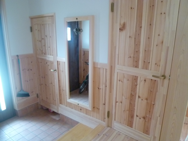 玄関脇のシューズクローゼット。めちゃくちゃ狭い。ドアを2つ付けて中を通れるようにしたのに、全然通れない・・・( ̄ω ̄ ;)こんなに狭くなってしまった理由は・・・、設計の段階で、ちょっといろいろあって玄関を広くしてしまった為。それと屋外に物置がないので、なんでもここへ詰め込んでいる為。自転車、芝刈り機、給水タンク、園芸用品、カー用品パルシステムの保冷箱、ゴルフバック、それに資源ごみの仮置き・・。玄関入ってすぐのドアを開けると、一歩もなかに入れない状態。ホール側のドアをあけてみても・・・狭い。 本当は、ベビーカーやパパの自転車、それにタイヤも置きたい。やっぱり屋外物置は必要かな~駐車場の奥に作ってもらう予定はありましたが、中止に。駐車場が南側にあるので、そこに物置造ったら暗くなりそうなのでね。家の裏側に作ってもらおうかな、とも思いましたが使い勝手が悪そうで・・・。どうしよーか悩み中。かわいい小屋みたいなの作ってもらえたらいいけどなぁ。 にほんブログ村