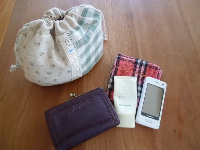いつも持ち歩くもの。バックの中身。お財布、携帯電話、ハンカチ、ハンドクリーム。そして細々しているものを詰め込んだ巾着。お財布はもう何年も使ってるからボロボロ。なので後姿ですが。ハンカチと携帯電話は必須です。コロンとした巾着の中身は・・・扇子、鏡、エコバック、ポケットティッシュ、ウェットティッシュ、頭痛薬、絆創膏、マスク、などなど。巾着は最近購入しました♪(今まではダイソーの巾着でした(^m^;))ハンドクリームは夏でも頻繁に使うので、巾着には入れずにそのままバッグに。あと、最近はこの他に水筒。必ず持ちます。以前は、1日出る時にしか持ち歩かなかったけど、震災後は近くに行くのにも持つようになりました。停電になると、お店は閉まっちゃうし自動販売機も使えないのでね。以上が、バッグに入れていつも持ち歩くもの。でも、ベビちゃんが一緒の時は荷物が増えます。+ オムツセット、着替え、タオル、授乳用ケープ。授乳用ケープはすごく便利。どこでも授乳できるし、ストールにもなるし赤ちゃんの肌掛けにもなります。夫にはいつも荷物多すぎ!!って言われるけど、私にとってはこれがベスト。+++++++++++++++++++++++++++最近始めたケータイ日記。ミニブログ?リアルタイムブログ?っていうのかな。メインブログのブログパーツとして使えて、それがシンプルでとっても可愛いパーツなのに、楽天ブログには貼り付けられない~。他の方のブログでみて可愛いから始めたのにな・・・。この楽天ブログを教えてくれたOさんごめんなさい。引越ししたい(笑)**my life**にほんブログ村人気の授乳ケープにWガーゼ素材のカラフルなお色が登場♪ガーゼ素材なので、ママやベビーの肌にも優しい♪【メール便対応可】Wガーゼギンガムチェック柄・授乳ケープリンネル5月号掲載商品♪(メール便対応可)ICHIかぎ針編みレース付きストール【02P22Jul11】chou chou de maman/シュシュドママン/ワンピース/福袋/バッグ/リンネル/ナチュラル/ナチュリラ/n-closet/Come home!**★Chou Chou de maman シュシュドママンストール ガーゼフラワープリント(NAT)