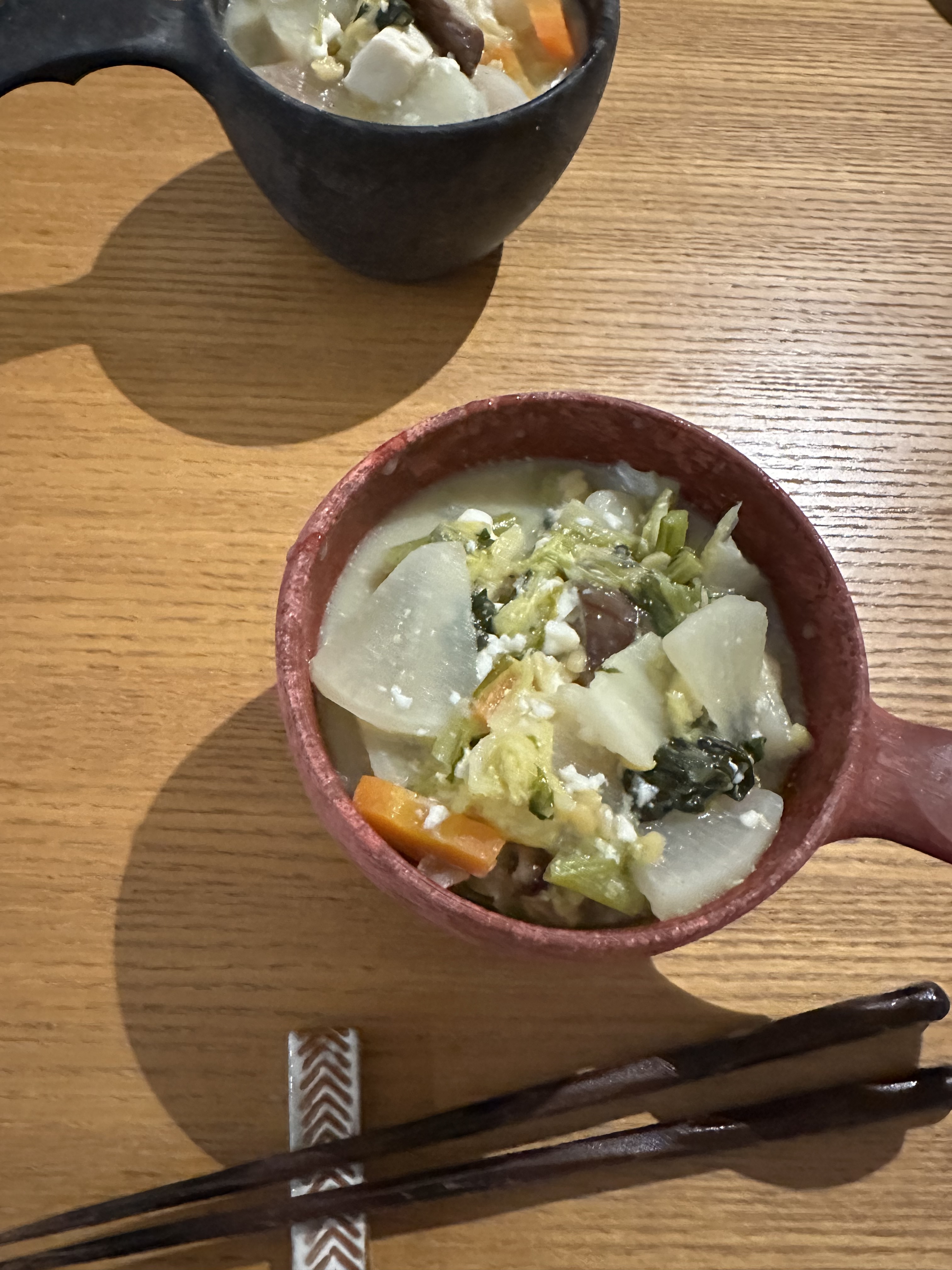 そういえば野菜スープゆるーく続いています月曜=野菜スープこの間相方に「何で野菜スープやってるんだっけ?」と聞かれいまさらε=ε=ε=ε=ε=ε=┌(; ̄◇ ̄)┘っと思ったけど逆流星⭐︎に流星してから(逆流性食道炎になってから)野菜より肉の方が消化が良いと勉強したようで野菜スープの日というのが果たして必要なのか?という今までやってきたことが何だったんだ?ってところまでいってしまった( ・∇・)で、参鶏湯を作ると張り切っていたのに断念したらしく、しょうがないなー“最強の野菜スープ作ったろか”ということに(前置き長っ)で出来たのがこちら↓見た目普通精進料理のようなスープですで、具材は、小松菜白菜人参大根豆腐レンズ豆まー良くいれる具材ですわで、調味料生姜麹酒粕味噌あとギリシャヨーグルト作ったときに余ったホエイどーだ(^◇^)ただある発酵系調味料色々入れてみただけだけど(笑)なんだかふかーい味になった気がするなんだか今まで味わったことのない甘くてちょっと酸っぱくてこくがあるようなそんな味最強ヾ(@⌒ー⌒@)ノ