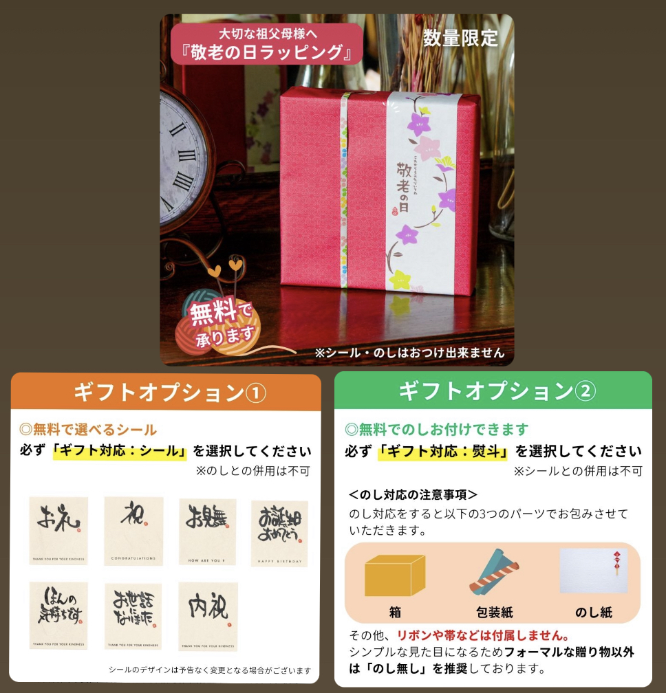 敬老の日スイーツギフトとしてご注文の場合は、敬老の日ラッピングを選択。(9月半ばまで限定)