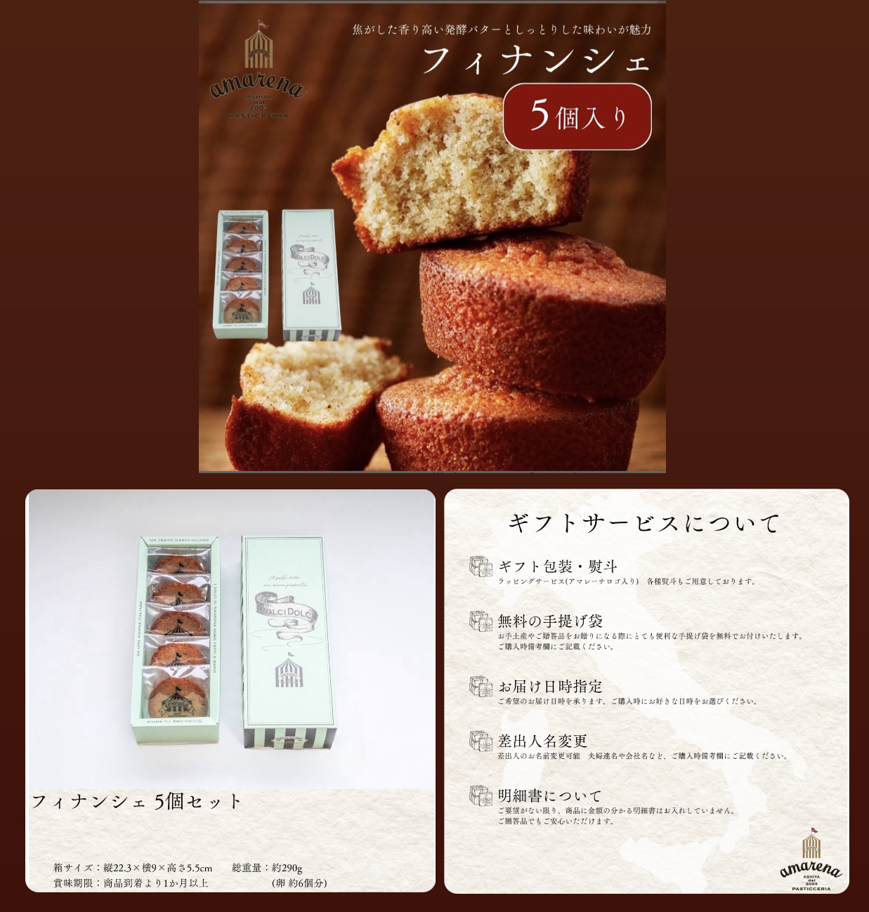 「アマレーナ」というイタリア菓子を作っているお菓子屋さんからフィナンシェが 5 個セットになったスイーツギフトです。